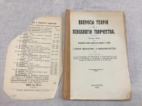 1914, изд-во: Тип-я `Мирный труд`, город: Харьков., стр. : 416 с., 1 л. прортр., обложка: Мягкая издательская обложка, формат: Увеличенный, состояние: Корешок подклеен полоской липкой бумаги, задняя обложка утрачена, передняя с утратами отделена. Блок в хорошем состоянии, несколько подчеркиваний. К. Тиандер. Очерк эволюции эпического творчества. Обзор сюжетов драматической поэзии. Сущность комедии. Исторические перспективы современной лирики. - Д. Н. Овсянико-Куликовский. Несколько мыслей о происхождении чувства `Бесконечного` в чистой лирике. Из лекции об основах художественного творчества. Лингвистическая теория происхождения искусства и эволюция поэзии. - А. Горнфельд. Трагедия. Из статьи `Муки слова`. Проза. Троп. Поэзия. - Е. Аничков Историческая поэтика А. Н. Веселовского. - В. Харицев. Что такое проза. - Т. Райнов. Лирика научно-философского творчества. - Б. Лезин. Художественное творчество, как особый вид экономии мысли.