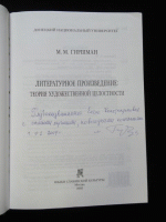 Гиршман М.М., Литературное произведение: Теория художественной целостности. Автограф автора.