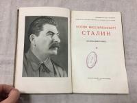 1940, изд-во: Институт Маркса - Энгельса - Ленина при ЦК ВКП(б), Политиздат при ЦК ВКП(б), город: Москва, стр. : 88 с., обложка: Тканевый переплет, формат: Обычный, состояние: В целом, хорошее (небольшие загрязнения обложки, следы цветных карандашей на передней обложке, владельческие карандашные пометы на форзаце и нахзаце, инвентарный номер на форзаце, штампы военной библиотеки на титульном листе, на странице 17 и на последней странице, множественные подчеркивания в тексте, рисунок цветными карандашами на нахзаце). Первое издание биографии Сталина, в котором были заложены основы культа его личности