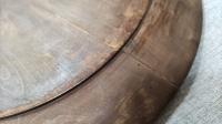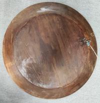 Молодая пара на свидании. Молодой человек играет на дудочке. По краю украшена растительным орнаментом сверху и снизу пары лебедей. Кустарное производство. Дерево - кедр. Диаметр 35 см. Очень хорошая сохранность. Трещина.