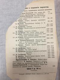 1914, изд-во: Тип-я `Мирный труд`, город: Харьков., стр. : 416 с., 1 л. прортр., обложка: Мягкая издательская обложка, формат: Увеличенный, состояние: Корешок подклеен полоской липкой бумаги, задняя обложка утрачена, передняя с утратами отделена. Блок в хорошем состоянии, несколько подчеркиваний. К. Тиандер. Очерк эволюции эпического творчества. Обзор сюжетов драматической поэзии. Сущность комедии. Исторические перспективы современной лирики. - Д. Н. Овсянико-Куликовский. Несколько мыслей о происхождении чувства `Бесконечного` в чистой лирике. Из лекции об основах художественного творчества. Лингвистическая теория происхождения искусства и эволюция поэзии. - А. Горнфельд. Трагедия. Из статьи `Муки слова`. Проза. Троп. Поэзия. - Е. Аничков Историческая поэтика А. Н. Веселовского. - В. Харицев. Что такое проза. - Т. Райнов. Лирика научно-философского творчества. - Б. Лезин. Художественное творчество, как особый вид экономии мысли.