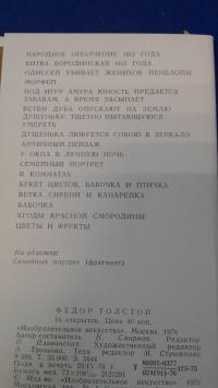 1976, изд-во: Изобразительное искусство, город: Москва, стр. : 16 отк., обложка: Мягкая обложка-папка, формат: Уменьшенный, состояние: Отличное. Перечень открыток: Народное ополчение 1812 года; Бородинская битва 1812 года; Одиссей убивает женихов Пенелопы; Морфей; Под игру Амура юность предается забавам, а время засыпается; Ветви дуба опускают на землю Душеньку, тщетно пытающуюся умереть; Душенька любуется собою в зеркало; Античный пейзаж; Уокна в лунную ночь; Семейный портрет; В комнатах; Букет цветов, бабочка и птичка; Ветка сирени и канарейка; Бабочка; Ягоды красной смородины; Цветы и фрукты.