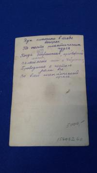 1939, город: Ленинград, формат: 13, 2 х 9 см., состояние: Очень хорошее. Наталия Михайловна Дудинская (1912 — 2003) — советская и российская балерина, педагог. Народная артистка СССР , лауреат четырёх Сталинских премий (1941, 1947, 1949, 1951). Кавалер ордена Ленина На обороте стихи: «Дух классики в тебе воскрес — / Не счесть пластических чудес, /Когда стремглав, проворней лани, /Взлетаешь ты с Чабукиани, / Проводишь с честью роли все /Во всей технической красе. . . ». Цитата из книги "Ленинградский балет. Дружеские шаржи и эпиграммы". Авторы: И. Гинзбург, Борис Лео, Александр Флит. Почерк сопадает с факсимиле из книги, но кто это из трех авторов, определить затрудняемся. Артефакт из истории ленинградского балета.