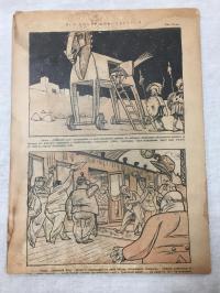 1917, город: Пг., стр. : 16 с., обложка: Мягкий, формат: Энциклопедический, состояние: Удовлетворительная сохранность. Загрязнения, следы влаги. Хранить этот номер в СССР было смертельно опасно. . В 1917 г. вышло 45 номеров журнала знаменитого журнала Аркадия Аверченко. Журнал изначально с ненавистью относился к большевикам, но продолжал выходить и после октябрьского переворота 1917 г. Был запрещен только в августе 1918 года на 18 номере. Это одна из загадок цензуры того времени - более злобного и издевательского не выходило и на белой территории. (Одна из версий - личное отношение Ленина к Аверченко, Вождю нравился его юмор). Все номера "Нового Сатирикона" за 1917 г. довольно редки. Аверченко политически был прозорливее многих "профессиональных" политиков. На весенних и летних номерах на обложках стоял лозунг: Да здравствует Республика!. В конце августа и начале сентября лозунг исчез (разочарование сатирика в Керенском). А в конце сентября появился лозунг: Отечество в опасности! - предсказание большевисткого переворота. Рассказы Аверченко из номеров 1917-1918 гг. не переизданы и сегодня. В номере не переизданный рассказ Аверченко "Дар данайцев" как немцы отправили в Россию позд с Лениным. . . . Послушайте, - нерешительно сказал Ленин. - А ваши немцы меня не укокошат? Все-таки я русский. - Вас?! Укокошат? Да что они враги себе, что ли? Хотите, на руках донесут до границы?! (Написано в апреле 1917 года!). На задней обложке иллюстрация к этому рассказу художника Ре-Ми: Все совершенствуется: Троянский конь в древности и поезд, "начиненный Лениным". Редкость.
