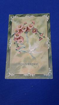 1910, город: Спб., состояние: Хорошее. След от приклейки в альбом. На обороте поздравление с Днем ангела. Технология конгревного тиснения создавала объемный эффект изображения, но удорожала открытку.